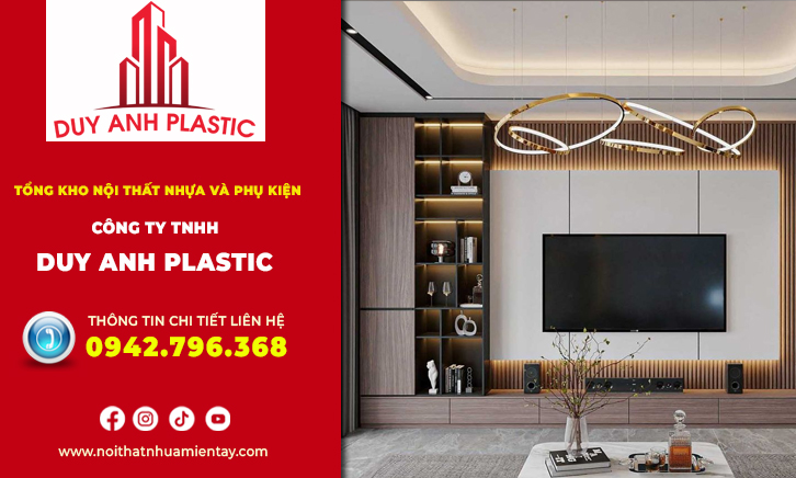 - Tủ trang trí nhựa Taiwan tivi: Kệ Tivi không chỉ để thiết bị mà còn là khung hình chính của cả căn phòng. Tivi được đặt ở chính giữa, xung quanh là hệ thống kệ trang trí, tủ cánh kính và vách nan nhựa trang trí phía sau.