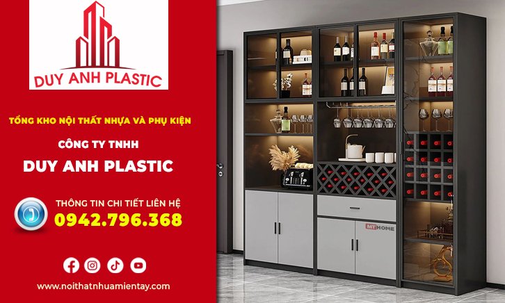 - Tủ trang trí nhựa Taiwan kết hợp tủ rượu: Đây là món nội thất giúp nâng tầm phòng khách, thể hiện gu thẩm mỹ tinh tế của chủ nhà. Sự phản chiếu ánh sáng lên các chai rượu tạo nên vẻ lung linh, đẳng cấp. Các ngăn nhựa được thiết kế đan chéo để đặt rượu nằm ngang, kết hợp với các ngăn đứng để ly quai cao.