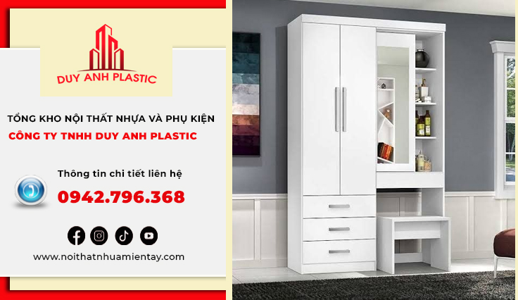 - Tủ kết hợp bàn trang điểm: Sản phẩm tủ quần áo nhựa DAPro 2 cánh được thiết kế thông minh, tích hợp bàn trang điểm ngay bên cạnh hoặc bên trong, mang lại sự tiện nghi tối đa cho người dùng, đặc biệt trong các không gian nhỏ. Kết hợp tủ quần áo và bàn trang điểm trong cùng một sản phẩm, tiết kiệm diện tích. Giúp tiết kiệm diện tích, vẫn đảm bảo đầy đủ công năng.